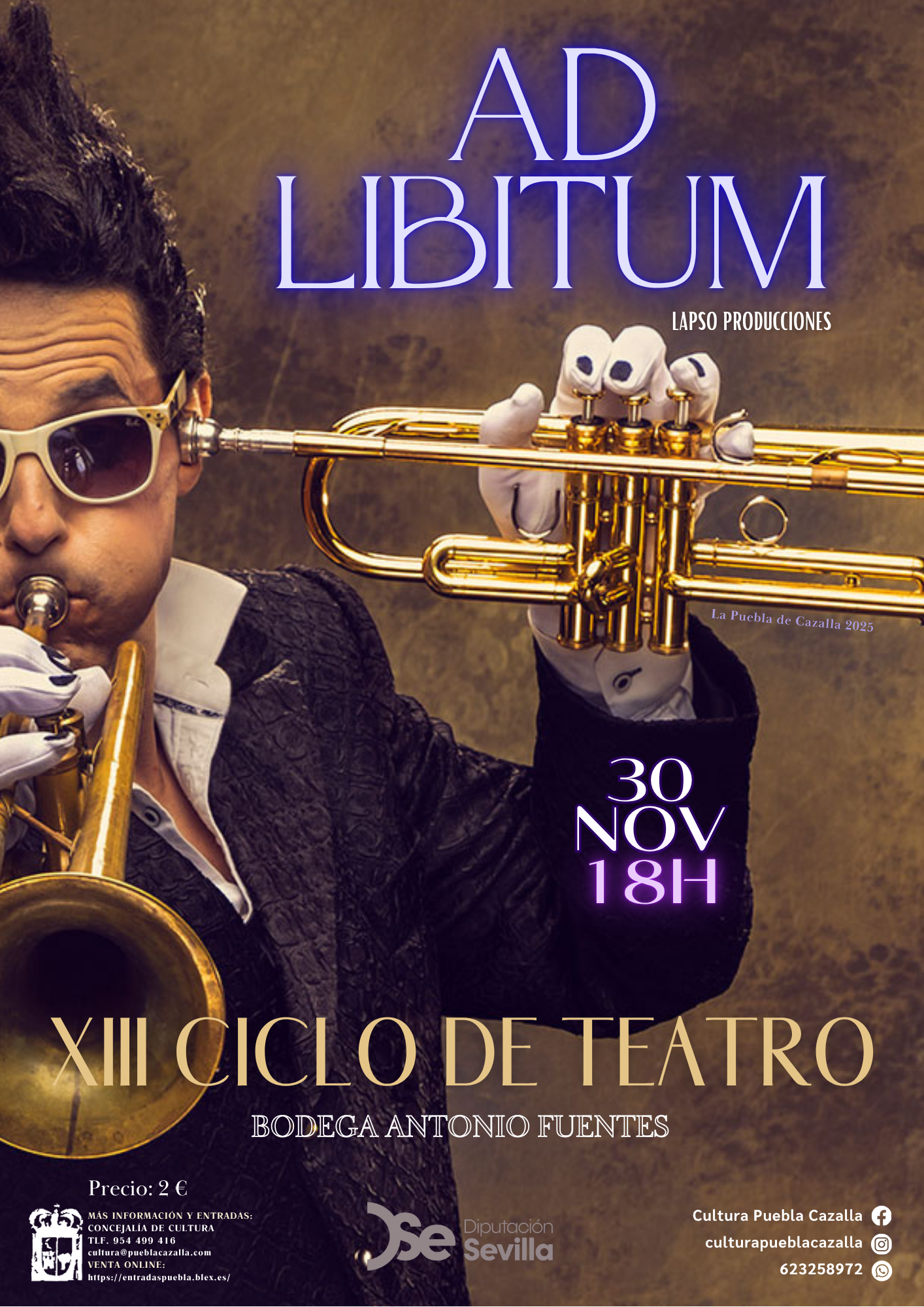 Pero si aplicamos la expresión a un espectáculo completo, el resultado es «Ad Libitum», la nueva creación de Lapso Producciones. Una obra teatral en forma de concierto que rompe con lo convencional, reinterpretando grandes obras de la música clásica con instrumentos musicales no convencionales como el Tripticófono Tuboidal, el Vidriolín y Vidrioncello Copodivarius, el Destilarmonium Percutente, o las percusiones de Olivetti, entre otros, bajo el prisma del humor blanco, y con total libertad creativa.